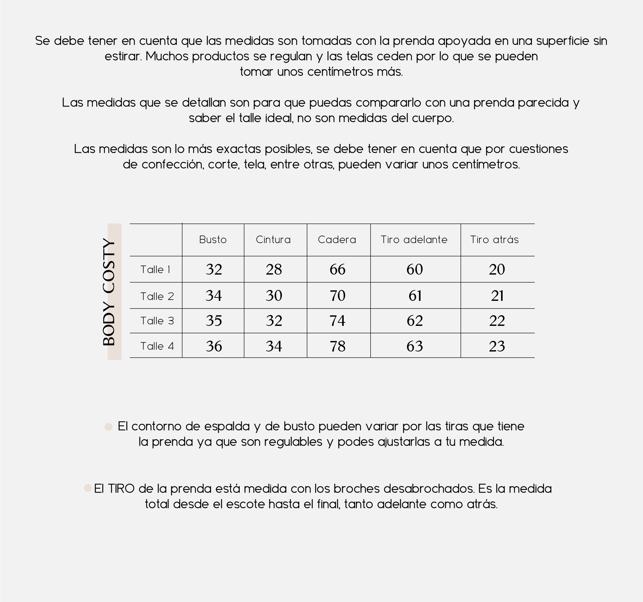 REFERENCIA: La modelo en la foto esta utilizando un talle 2. Tiene 86 cm de contorno de busto, 92 cm de cadera y 102 cm de cola. 1.68 cm altura.
