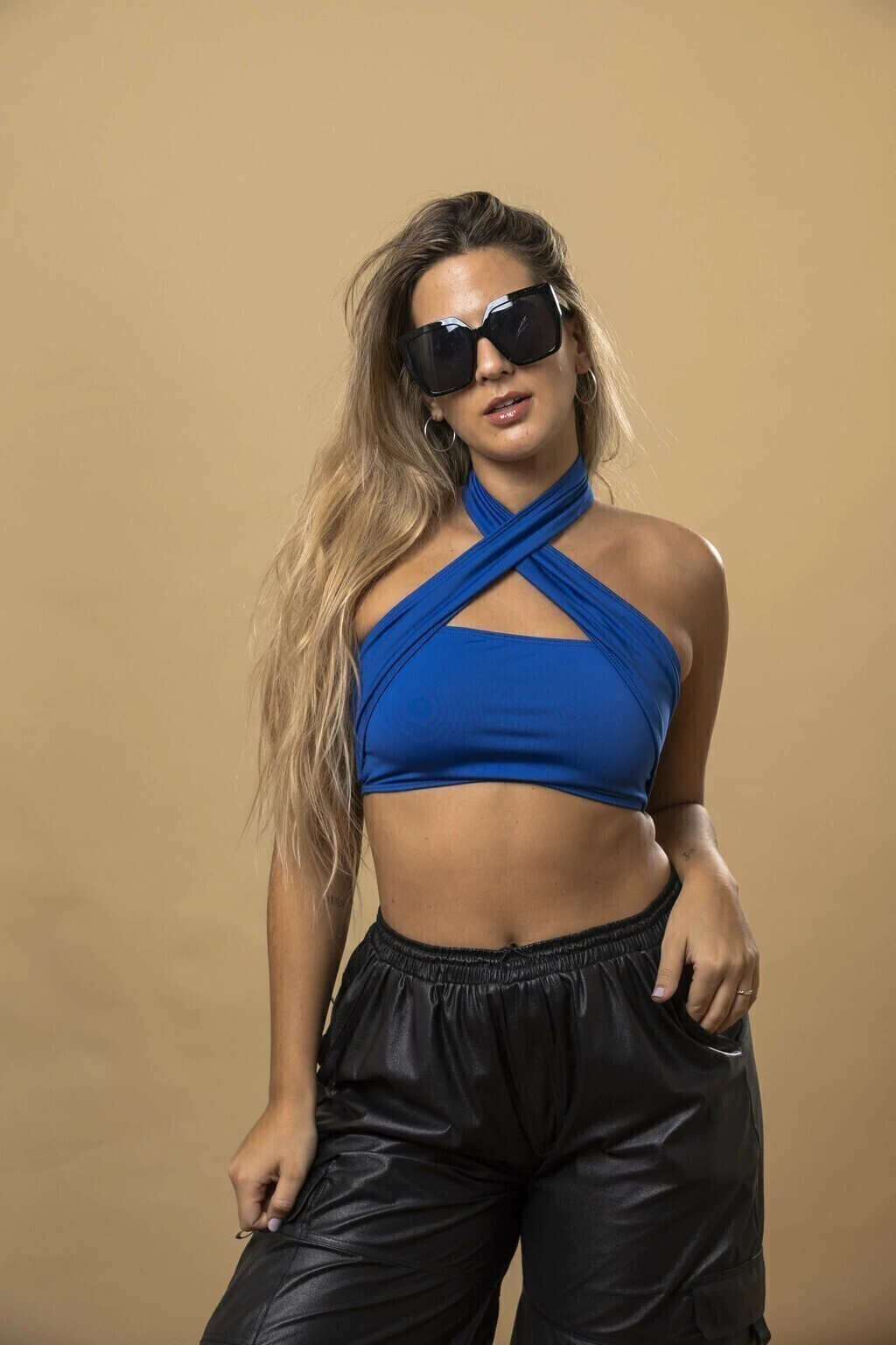 COLOR AZUL ELÉCTRICO - Top bando con tira que se cruza en el cuello, espalda cerrada. El bando tiene ballenitas en los costados para que sujete mucho mejor! Obviamente esta completamente forrado, en la espalda y en el busto, adelante tiene doble forreria por la abertura para las tazas desmontables. Cero escatimar en telas aca, calidad asegurada y no trasluce N A D A!